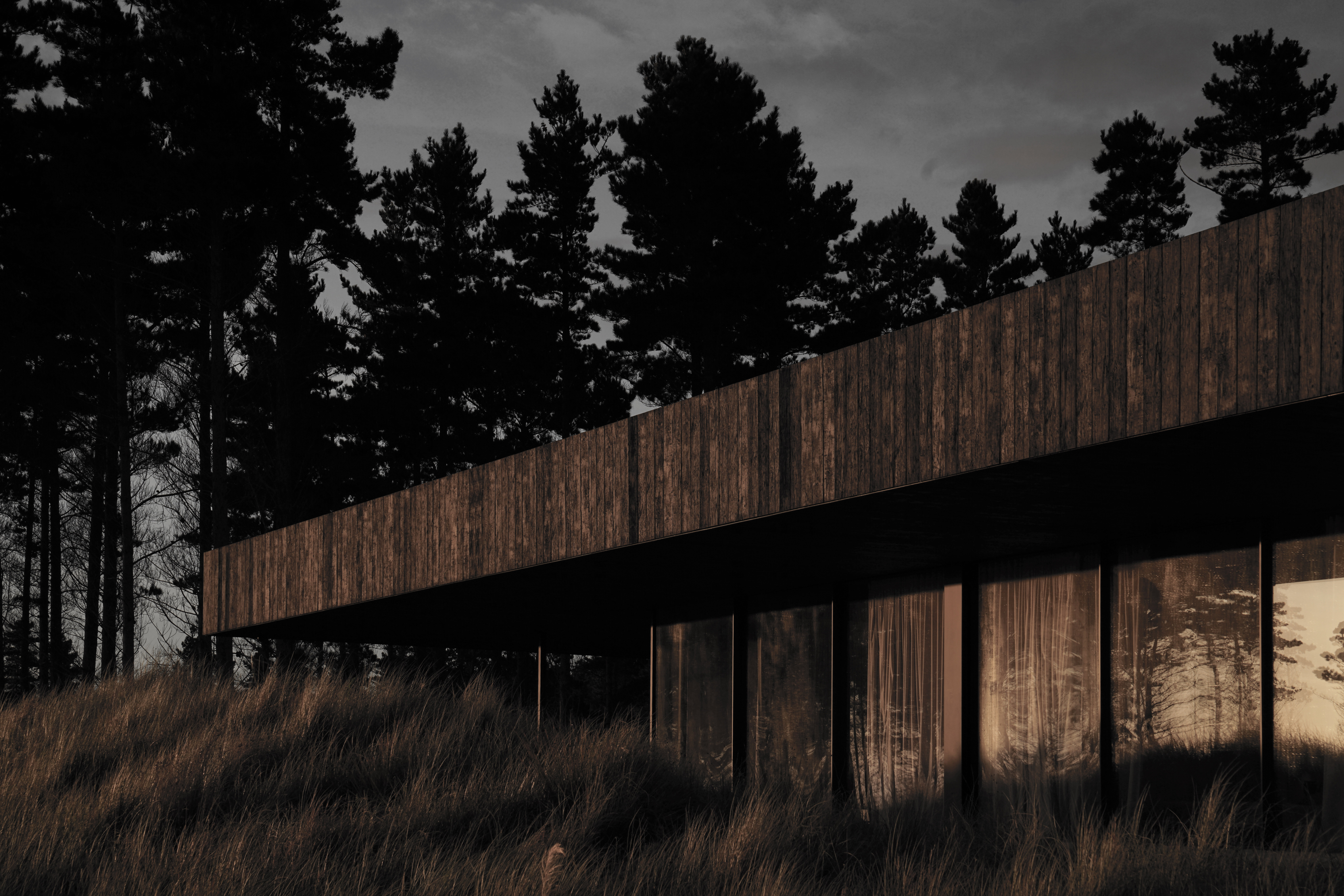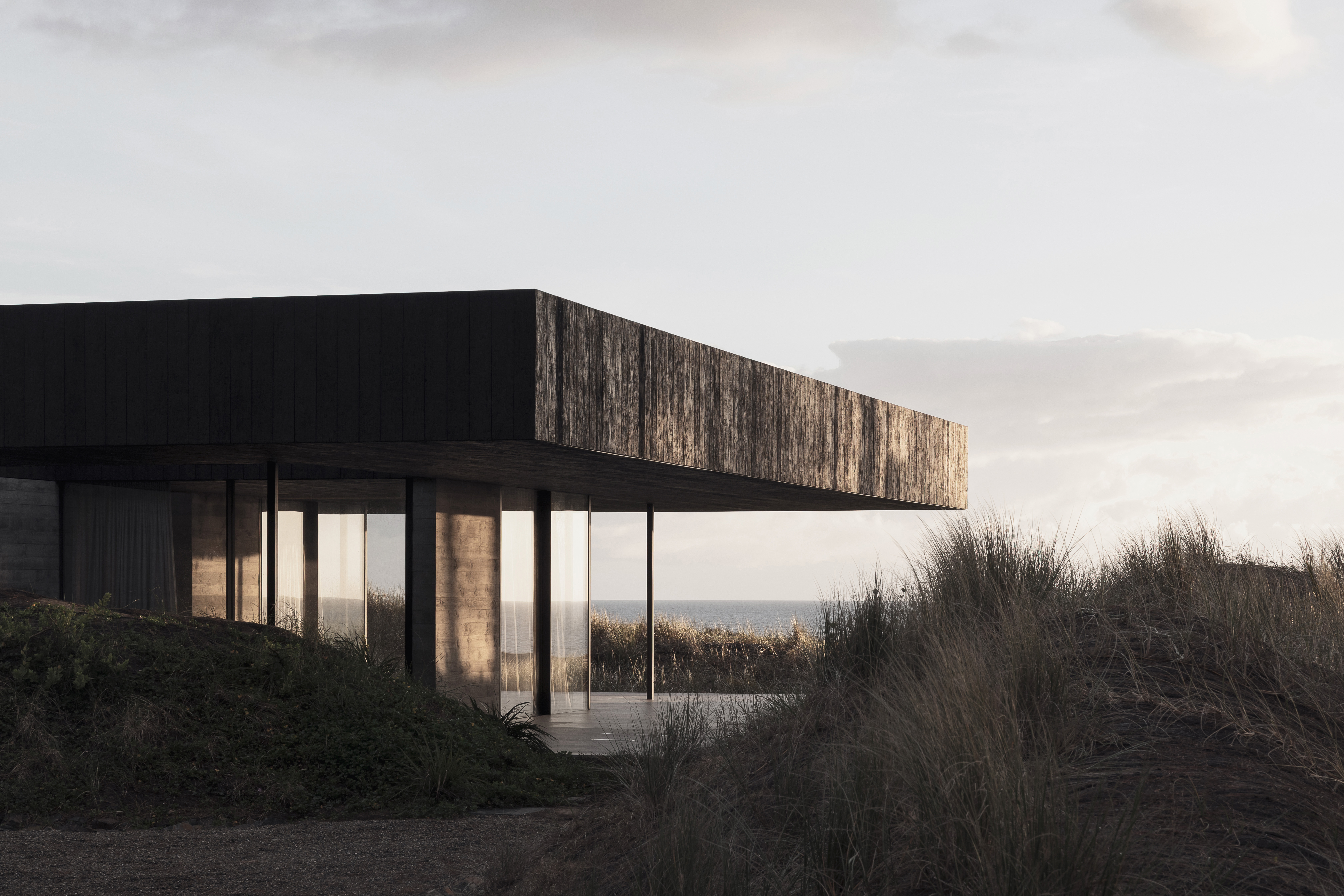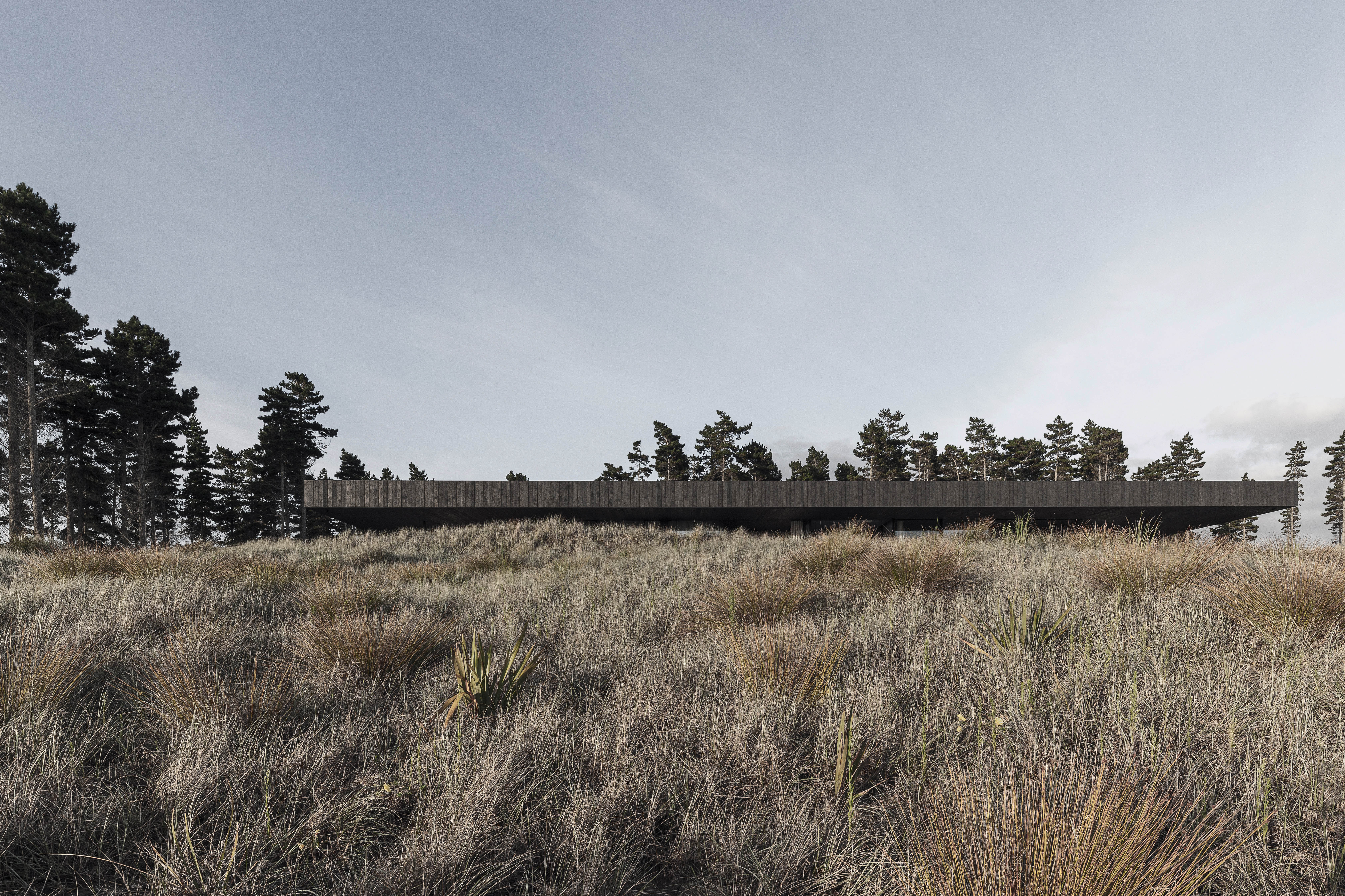This single-storey private residence occupies the threshold between a stand of new-growth pines and an expansive dunescape. In response to the open, windswept site, the building is conceived conceptually as a single monolithic stratum, pushed low to the ground and hovering just above the surface of the sands.