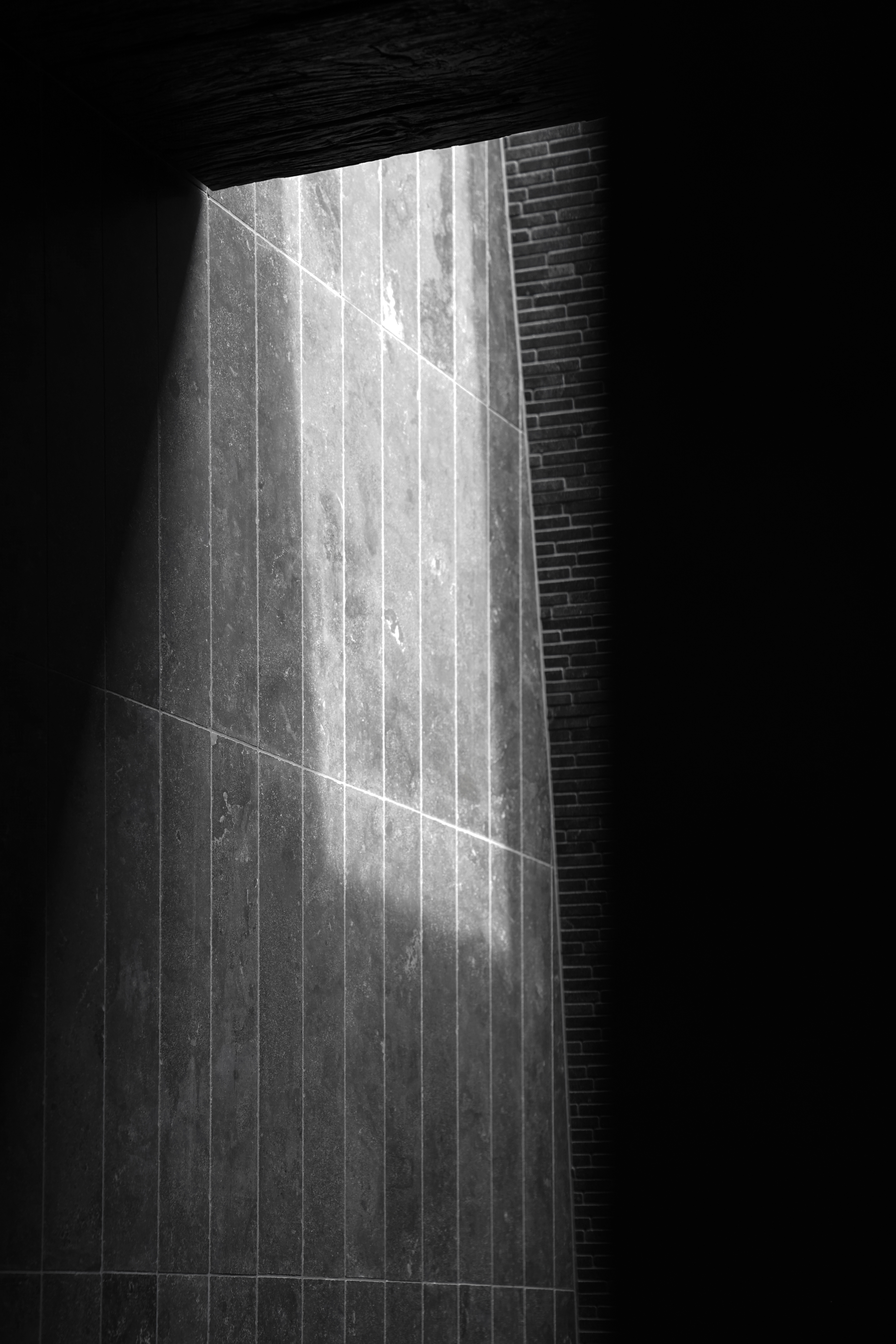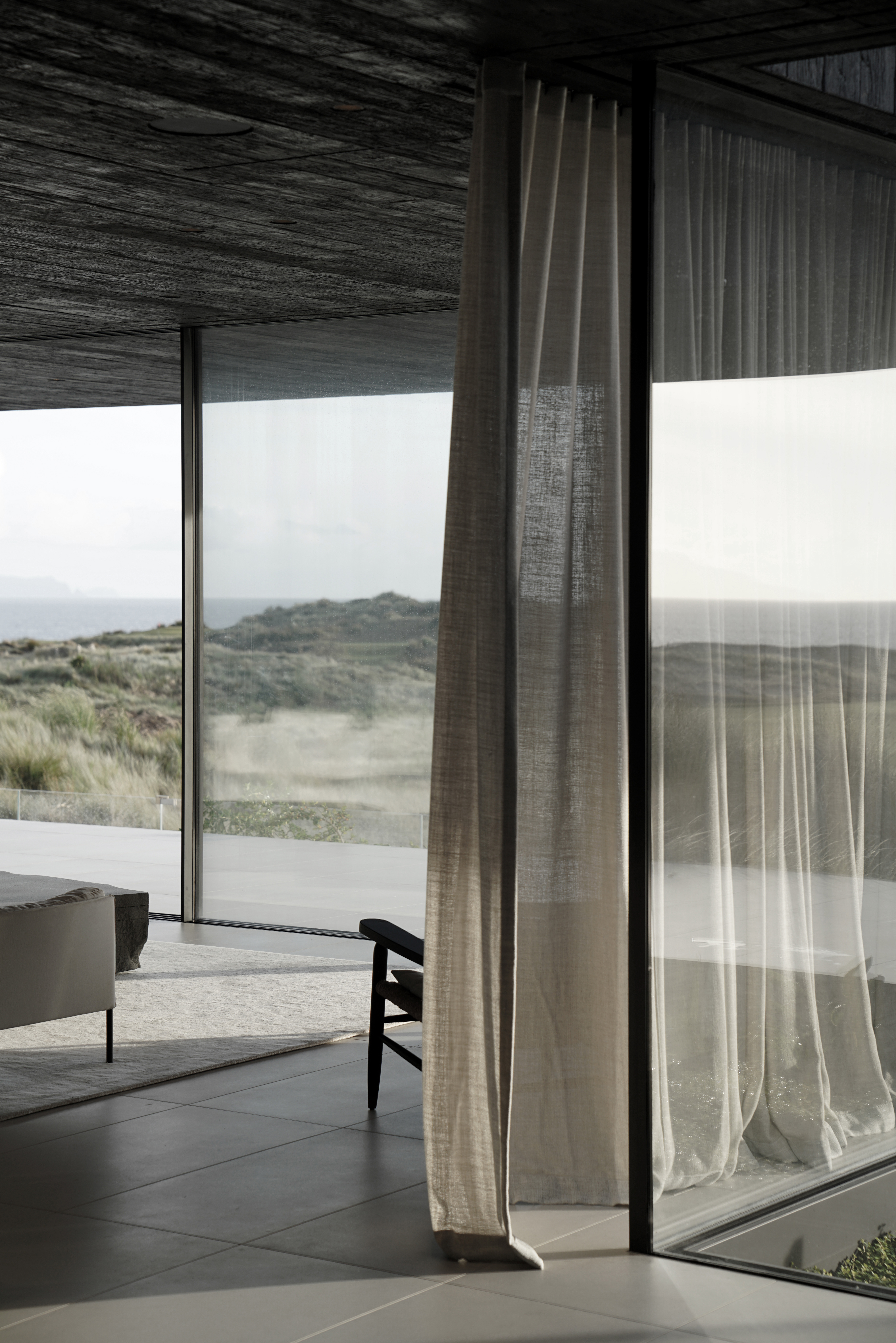 Beneath this monolithic plane, a private refuge forms in the compressed space between mass and earth. The interior regularity contrasts the curving dunes among which the building floats. Its materials throughout reflect the wood, sand, and stone that are the foundation of the wooded coastline.