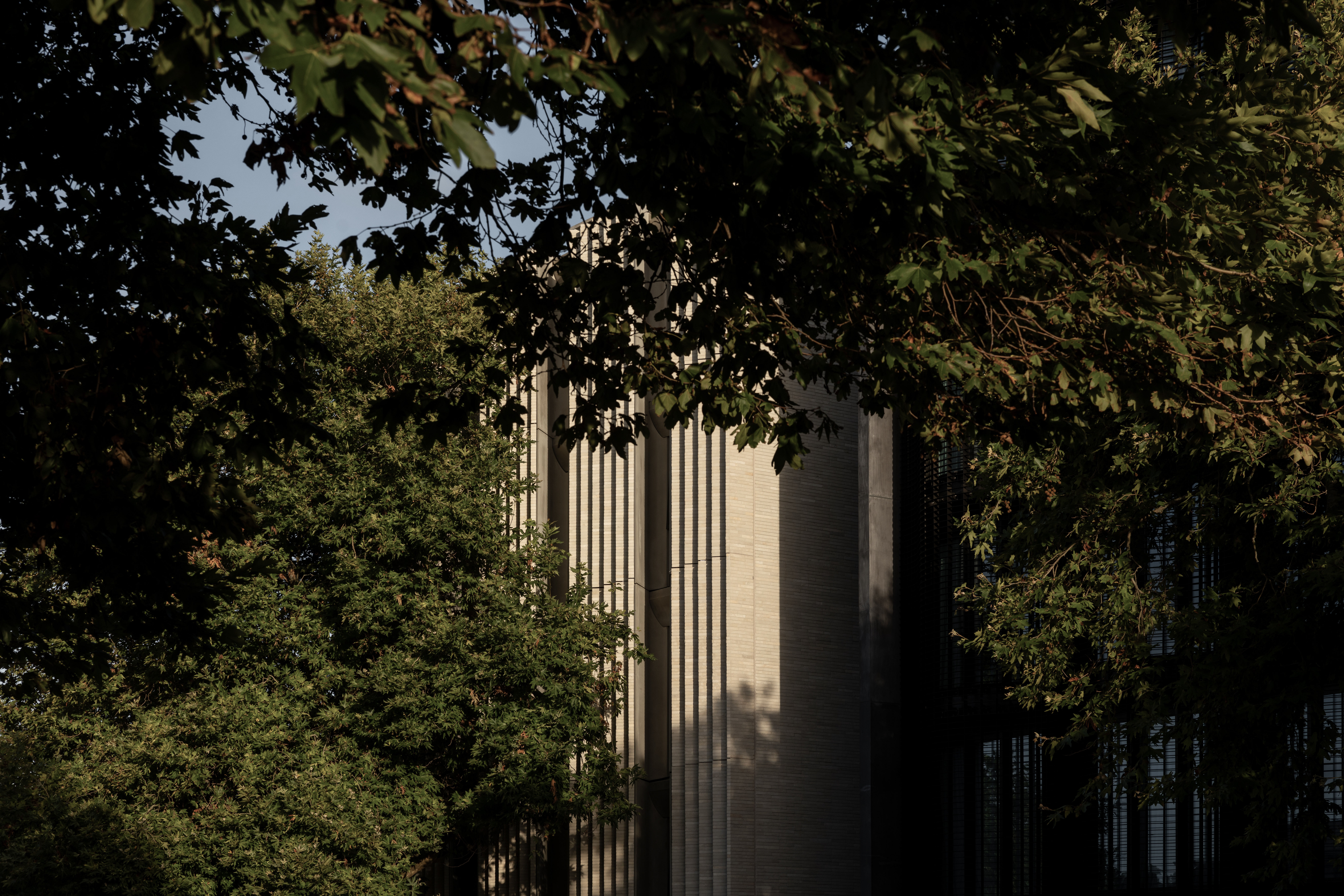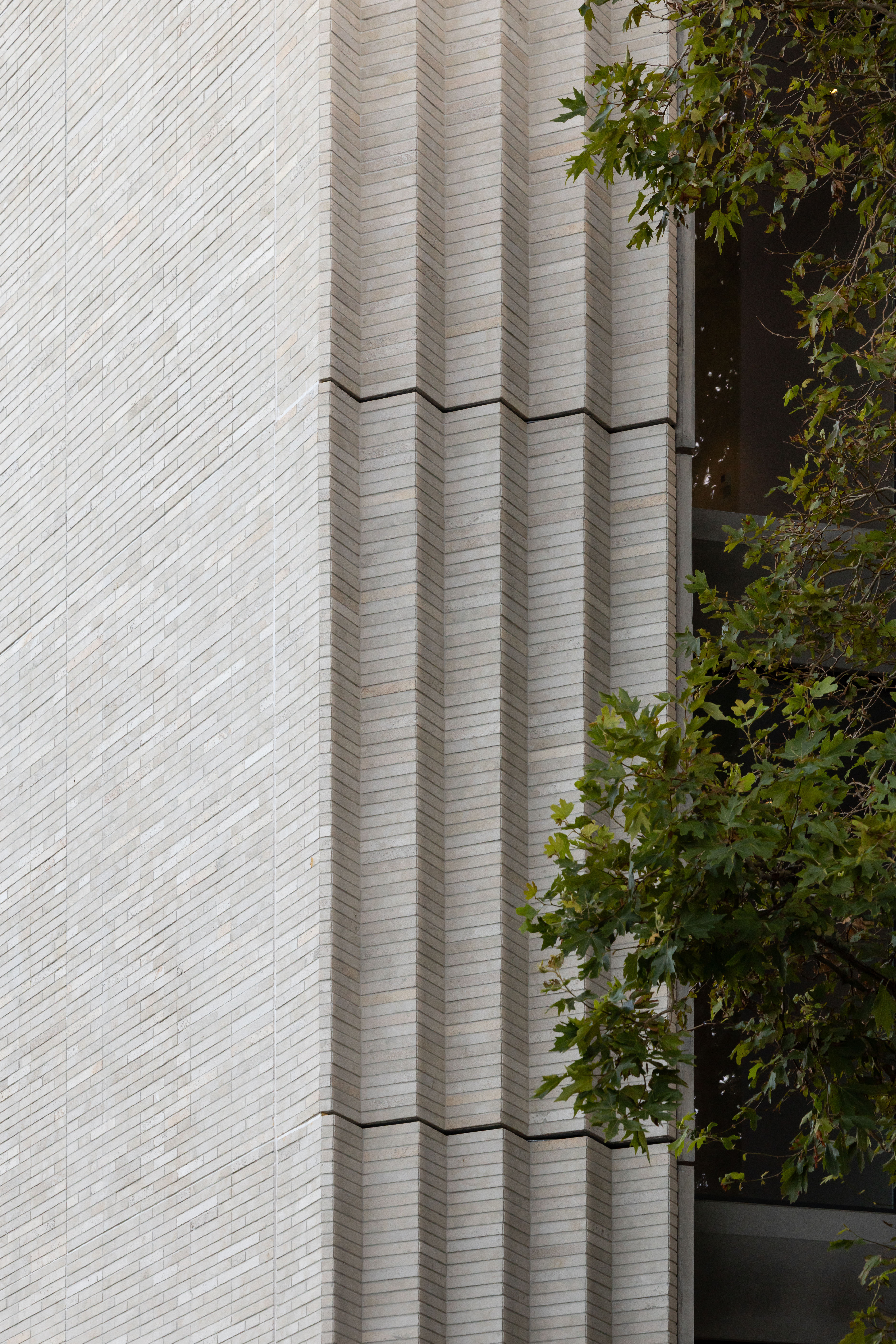 Clad in textured limestone brick and rendered concrete, the material palette shifts from tactile solidity to a soft refined interior. The continuous splayed stone screen spans four levels, filtering views and lending a sculptural modulation to the street frontage.