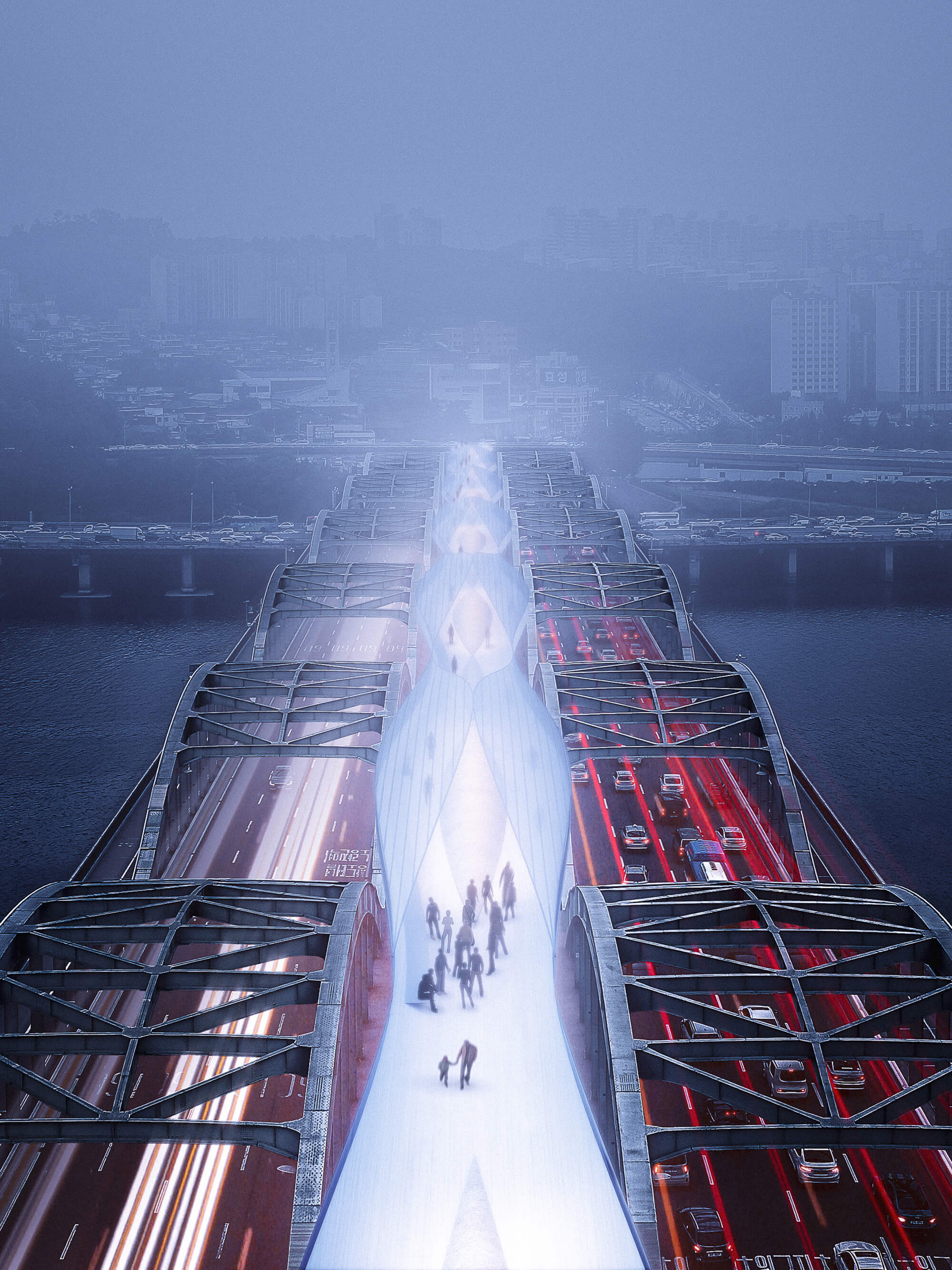 The Hangang bridge competition called for an elevated pedestrian skywalk to be built between two existing steel arch bridges.
